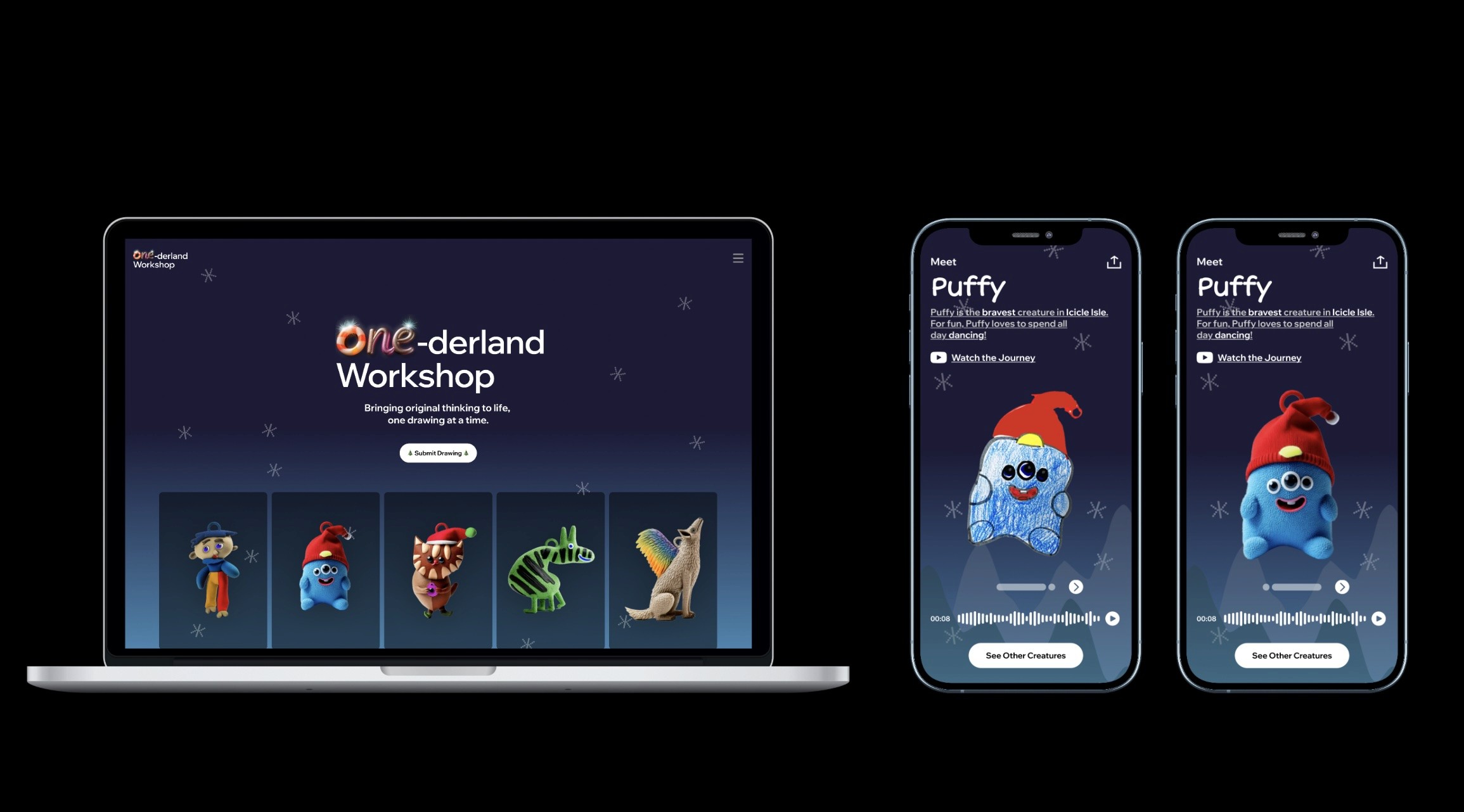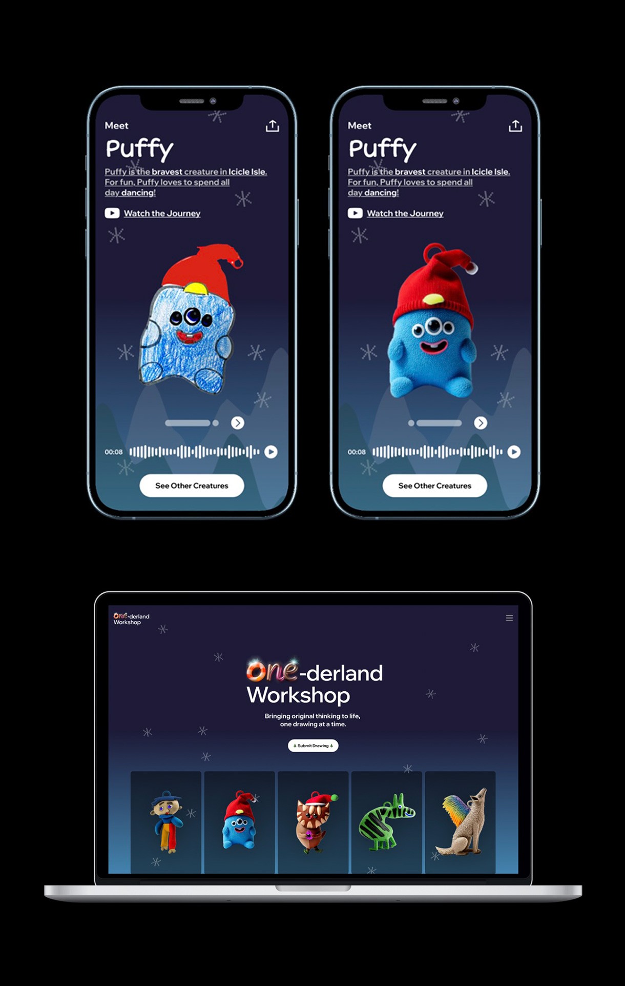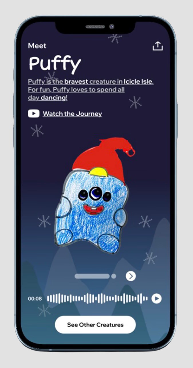 Through the One-derland Workshop, we transformed child drawings into 3D-printed figurine ornaments. Each piece included a QR code that let kids hear their own creatures tell and watch a story inspired by their ideas.